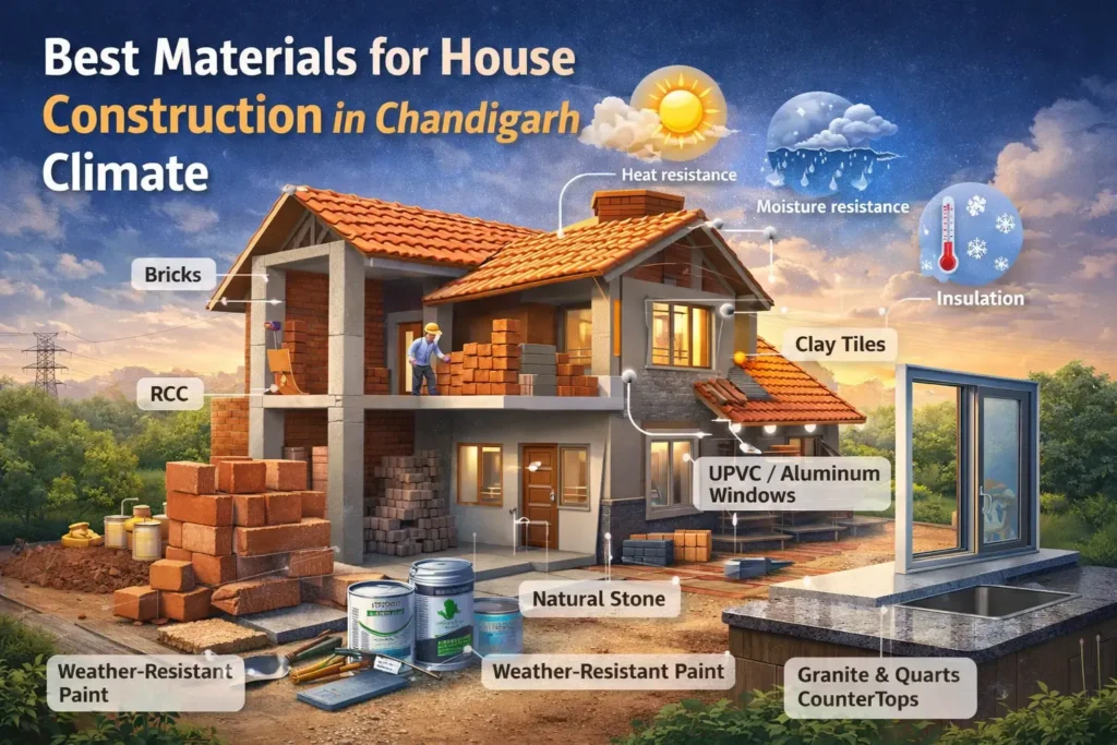Some of the materials that can be used for the construction of a house in the region of Chandigarh include strong bricks, reinforced concrete structures, stone flooring, roofing solutions, strong materials for the kitchen and bathrooms, UPVC windows, and wooden flooring.