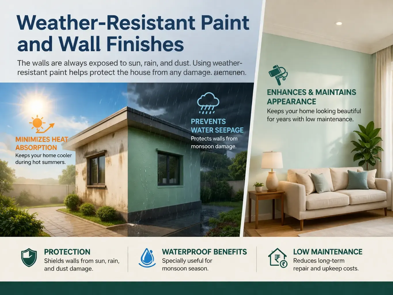 The walls are always exposed to sun, rain, and dust. Using weather-resistant paint helps protect the house from any damage.